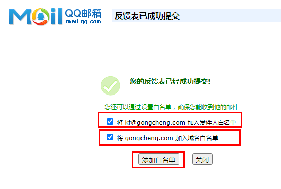3. 勾选“将 kf#gongcheng.com(#换成@) 加入域名白名单”,并点击“添加白名单” 。以后QQ邮箱就不会拦截工程网的邮件了(如下图):