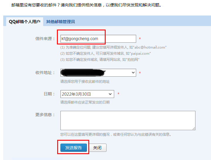 2. 信件来源填写:kf#gongcheng.com(#换成@),并点击“发送报告”(如下图):